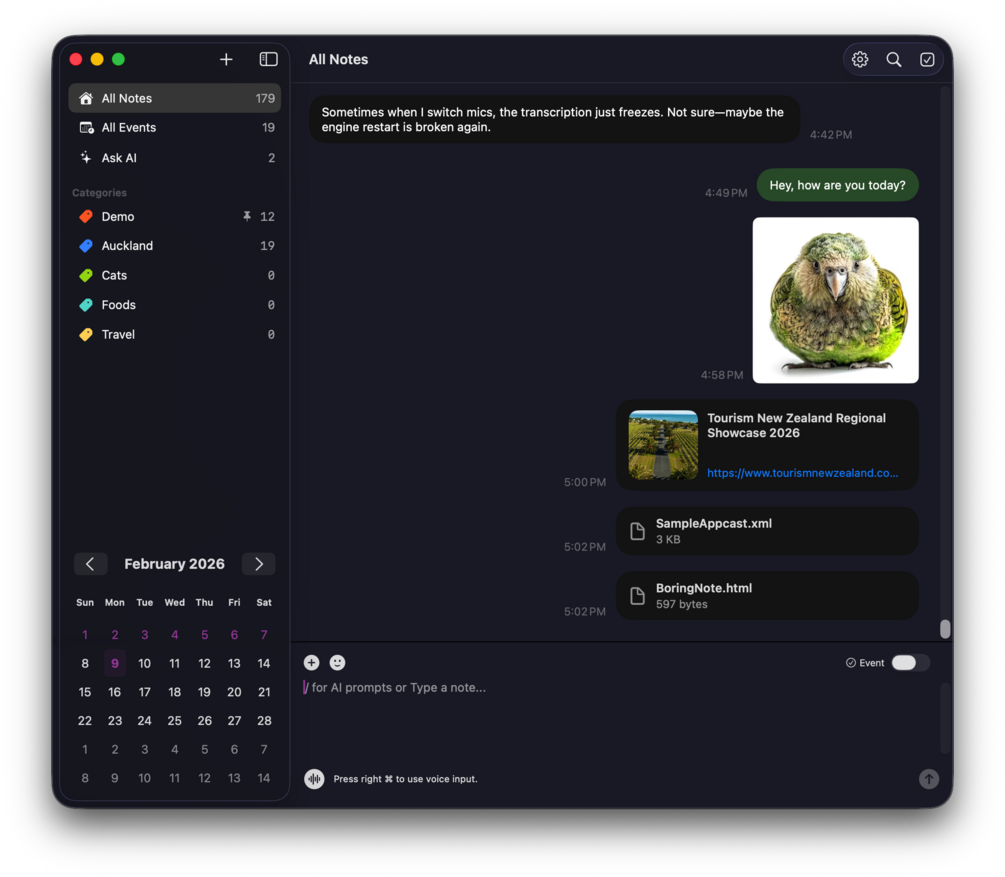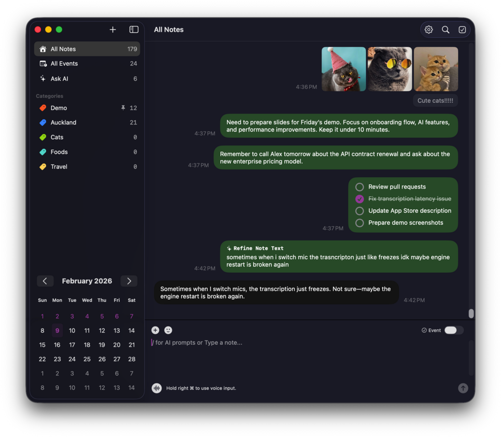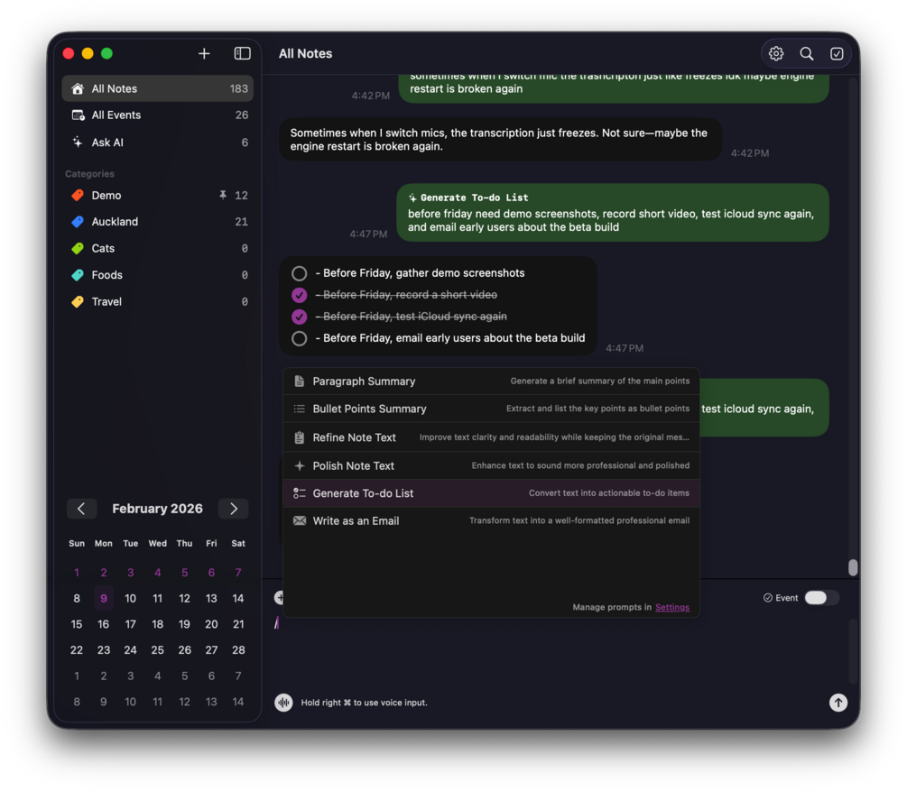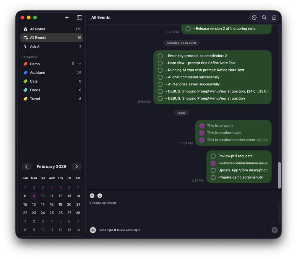 BoringNote lets you write, speak, and organize your ideas effortlessly in a natural, chat-style interface. Whether you’re working, or multitasking, just press a key and start speaking — your thoughts are instantly transcribed, refined, and saved like sending a message.